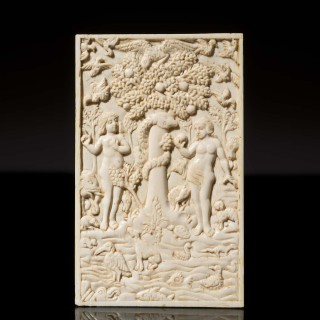 Plaque en ivoire sculpté en bas-relief représentant Adam et Ev ...