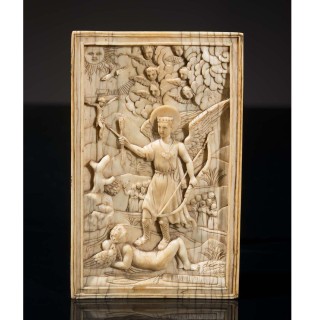 Plaque en ivoire sculpté en fort reliefreprésentant l’Amour divin terrassant l’Amour