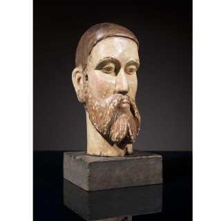 Tête de saint en bois sculpté, polychromé,évidée avec ouverture ovale à l'arrière. Visage