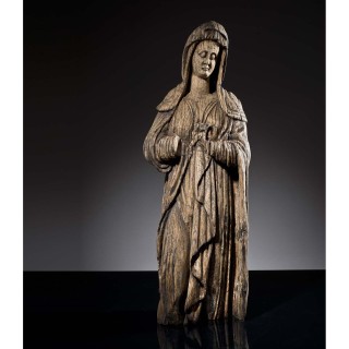 Vierge de Calvaire en chêne sculpté en rondebosse avec traces de polychromie. Debout, lajambe droite avancée, la tête inclinée vers la