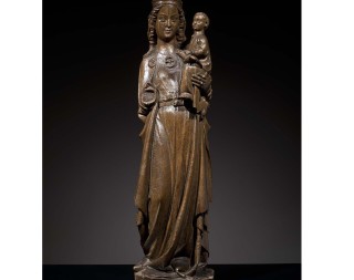 Vierge à l’Enfant en ivoire sculpté en rondebosse. De canon élancé, elle est assise sur unbanc-trône, son pied gauche appuyé sur un