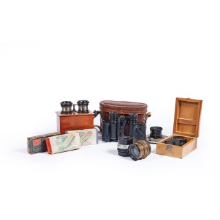 Lot d'objectifs pour appareils photos, paire de jumelles, visionneuses et plaques de verres.