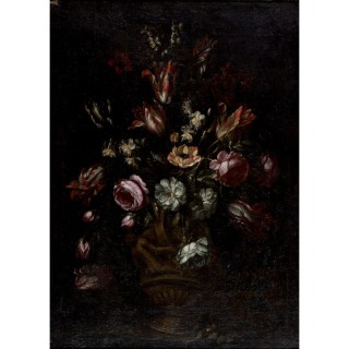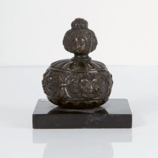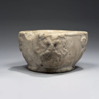 Mortier en marbre à quatre prises, deux en forme de tête d'homme barbu, deux autres avec un croissant sur un cartouche.Italie, XVIe ...
