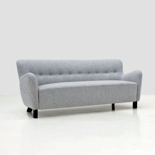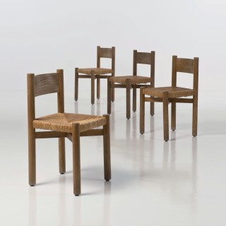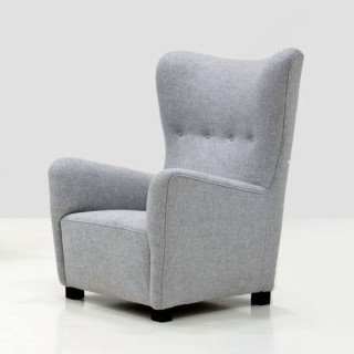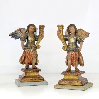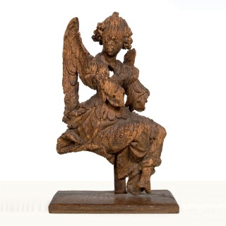 Ange en chêne sculpté en ronde-bosse, dos creusé. Assis, les jambes de profil et la tête tournéevers la gauche ; tête à la coiffure ...