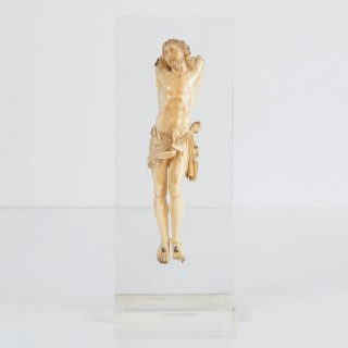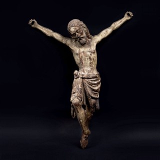 Christ en bois sculpté et polychroméavec restes de dorure. Beau visage ovale àl’expression sereine avec les yeux mi-clos ;chevelure ...