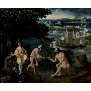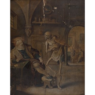 Panneau en chêne sculpté en bas-relief et polychromé représentant le Trône de Grâce.XVIe siècleH 50,9 cm - Largeur : 29,8 cm(petite ...