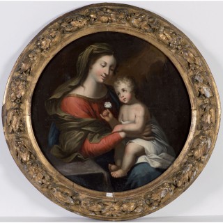 Bassin en laiton repoussé et poinçonné à décor d'une Viergeà l'Enfant sur un croissant au milieu de rayons lumineux ;frise de feuill...