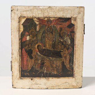 Tableau peint sur fond or à décor d'un saint personnage tenant un livre dans sa main dans les styles des icônes du XVIIe siècle.Cadr...