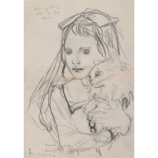 Léonard Foujita (1886-1968)Jeune fille au chat, 1950Dessin à la mine de plombSigné, daté et situé Paris, 14.7.50 en haut à gauche, s...