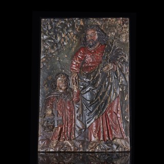 Panneau en chêne sculpté en bas-relief et polychromé représentan ...