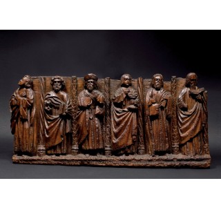 Partie de retable en chêne sculpté en fort relief représentant six apôtres dont saint Jean, saintPierre, saint Jacques vêtu en pèler...