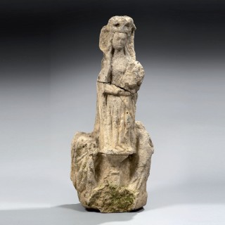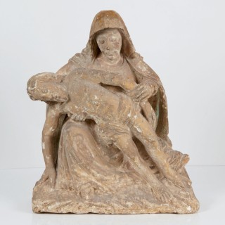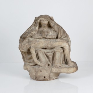 Vierge de Pitié en pierre calcaire sculptée. Assise, Marie tient son Fils devant elle ; voilesurplombant le visage aux traits réguli...