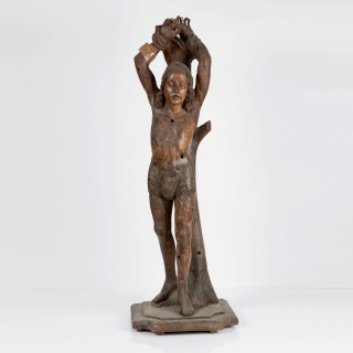 Saint Sébastien en noyer sculpté en ronde-bosse. Adossé à un tronc d'arbre, la jambe gaucheavancée, le jeune saint lève les deux bra...