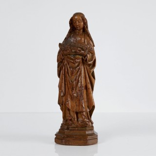 Sainte Lucie en bois sculpté, polychromé et doré, dos creux et refermé. Debout, la jambe droitelégèrement fléchie, la sainte tient u...