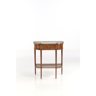 Table console en acajou de forme demi-lune, ouvrant à un tiroir, le dessus de marbre blanc