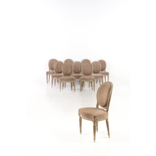Neuf chaises en bois mouluré et peint à dossier médaillon en cabriolet, reposant sur des pieds