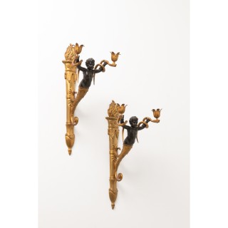 Paire d'appliques en bronze doré formées par des mufles de lion ...