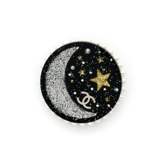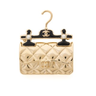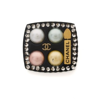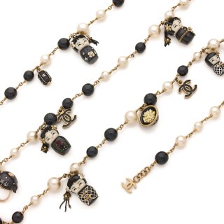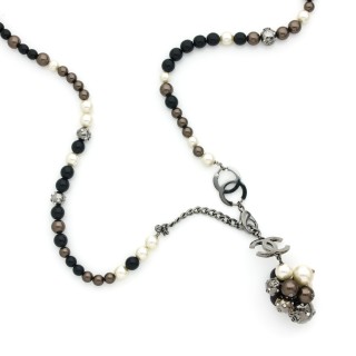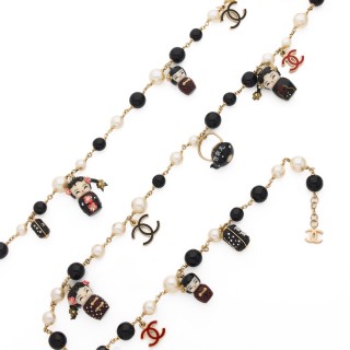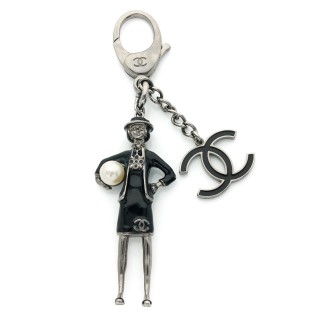 CHANEL PORTE-CLÉS en métal canon de fusil émaillé noir strassé, perle d'imitation, pendeloques et fermoir siglés