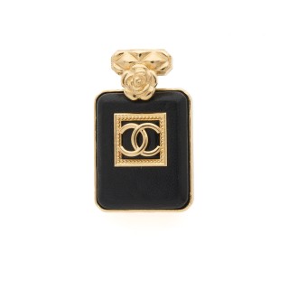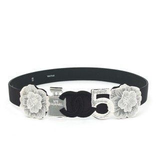CHANEL - 2006 CEINTURE en cuir recouverte d'ottoman noir, camélias, flacon de parfum signé et siglé en textile, pressions