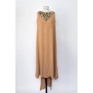 CHANEL - Resort 2015 ROBE en crêpe de soie cappuccino, plastron et décolleté au dos rebrodés de paillettes, sequins et petites perle...