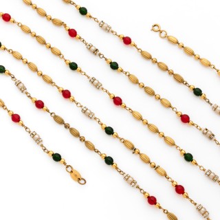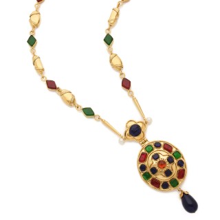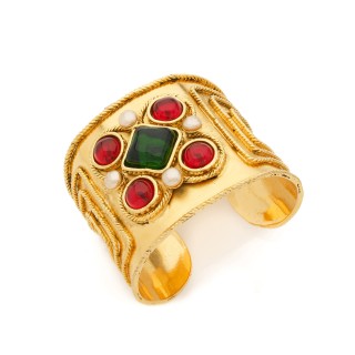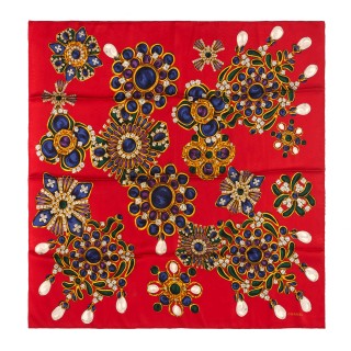 CHANEL CARRÉ en satin de soie rouge imprimé à décor de bijoux en métal doré tutti frutti