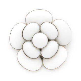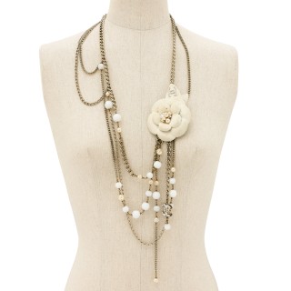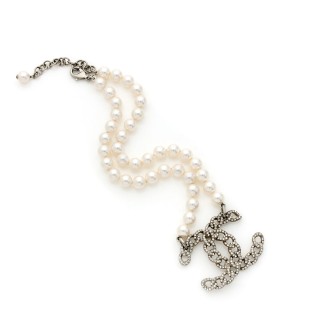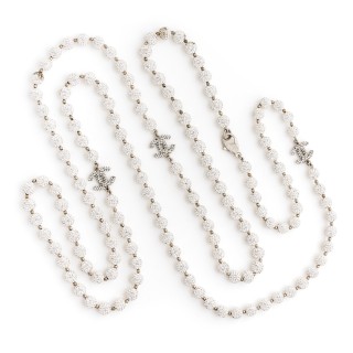 CHANEL - 2005 CEINTURE chaîne en métal argenté entrecoupée de perles de verre blanche et d'imitation, camélia avec sigle strassé