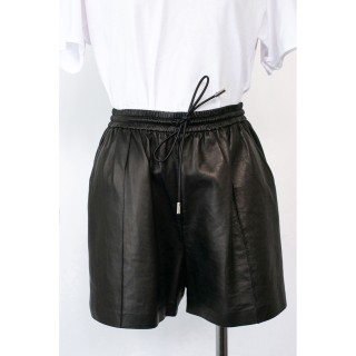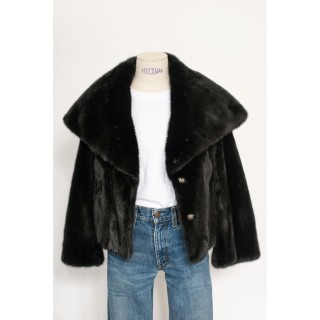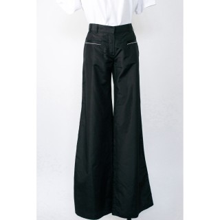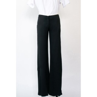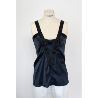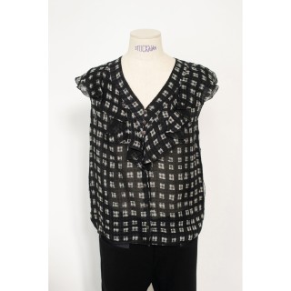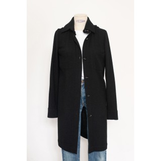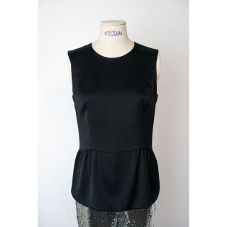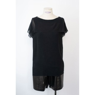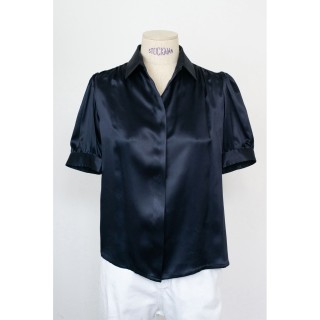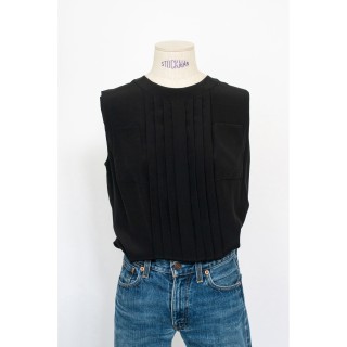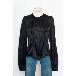 CHANEL BLOUSE en crêpe de soie noir à plis religieuse verticaux, deux poches, un bouton siglé en métal argenté à la nuque, les autre...