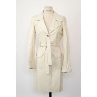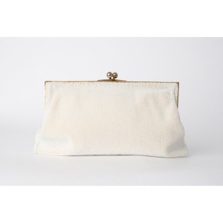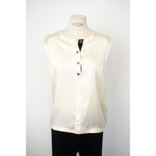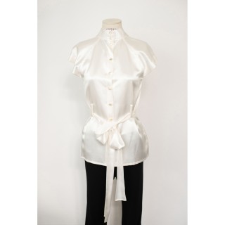 CHANEL BLOUSE en crêpe de soie blanc à plis religieuse verticaux, deux poches, un bouton siglé en métal argenté à la nuque, les autr...