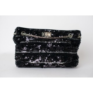 CHANEL - Printemps-été 2007 ROBE en crêpe de soie noir ornée de paillettes, effet d'encolure bénitier, tirette siglée en métal argenté