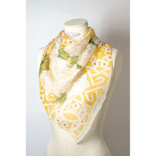 CHANEL CARRÉ en mousseline de soie imprimée à décor de sigles, camélias et motifs géométriques sur fond bouton d'or
