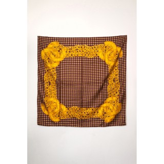 CHANEL CARRÉ en satin de soie imprimé à décor de sigles et de chaînes en métal doré sur fond vichy taupe et aubergine