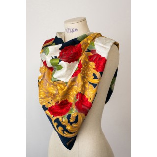 CHANEL CARRÉ en twill de soie imprimé siglé à décor de dorures et de fleurs sur fond marine