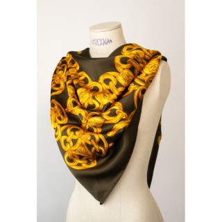 CHANEL CARRÉ en satin de soie imprimé siglé à décor de chaînes dorées siglées sur fond kaki