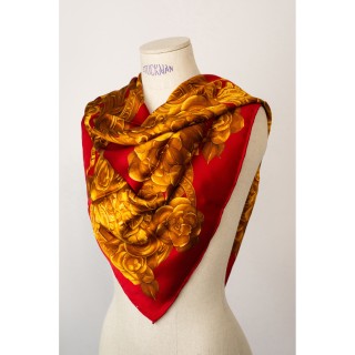 CHANEL CARRÉ en satin de soie imprimé siglé à décor de dorures sur fond grenat