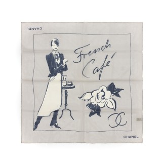 CHANEL CARRÉ en mousseline de soie gris perle imprimé figurant une garçonne de café et l'inscription "French café"