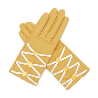 HERMÈS GANTS en agneau plongé jaune et entrelacs blanc, motifs en métal doré signés
