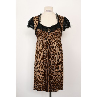 DOLCE & GABBANA ROBE BABY DOLL en crêpe de soie imprimé panthère et dentelle noire, une pampille en métal doré strassée retenant un ...