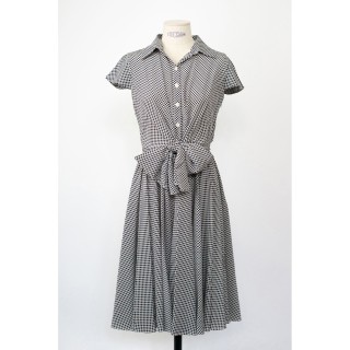 CHRISTIAN DIOR BOUTIQUE X JOHN GALLIANO - 2000's ROBE en crêpe de soie écru imprimée de pois marine, corsage boutonné signé avec eff...