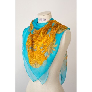 CHANEL CARRÉ en mousseline de soie imprimée à décor de sigles et de chaînes en métal doré sur fond bleu