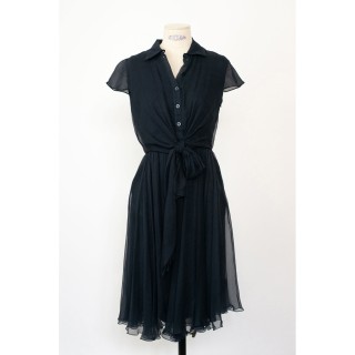 CHRISTIAN DIOR BOUTIQUE X JOHN GALLIANO - 2000's ROBE en mousseline crépon marine, corsage boutonné signé avec effet de pans noués à...