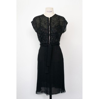 PRADA - Circa 2003 ROBE COCKTAIL en mousseline crépon noir sur fond bordé de dentelle à l'ourlet, corsage zippé rebrodé de perles et...