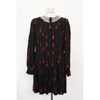 SAINT LAURENT X HEDI SLIMANE - 2015 ROBE en crêpe de soie mélangée façonnée noir rebrodé de guitares rouge, col en guipure écru, poi...