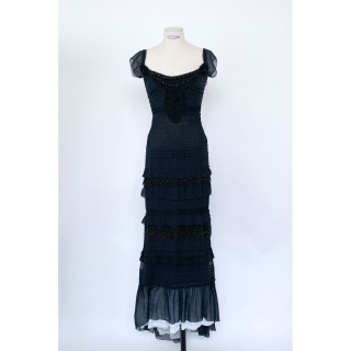 PRADA FOURREAU DU SOIR en mousseline crépon plissée volantée étagée rehaussée de tulle rebrodé de perles et de cabochons, corsage sm...