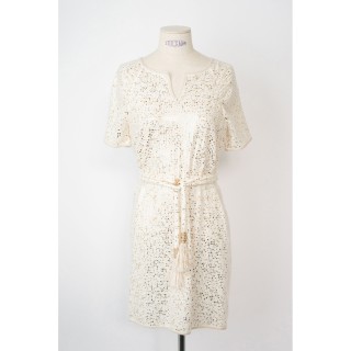 CHANEL ROBE en angora et soie ivoire façon mosaïque appliquée de paillettes argentées et dorées, épaules légèrement drapées, plaque ...