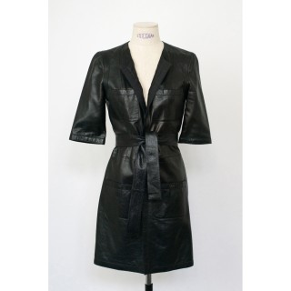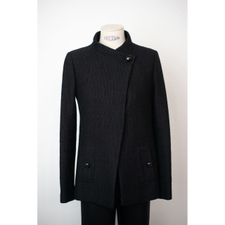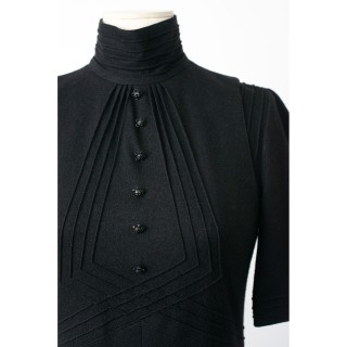 CHANEL - 2006 ROBE d'inspiration chasuble en lainage stretch noir très légèrement métallisé, effet de nervures géometriques, boutons...