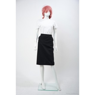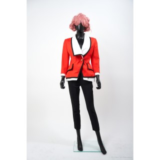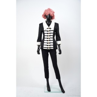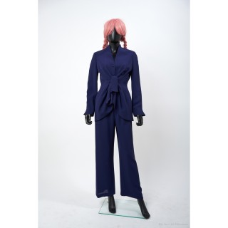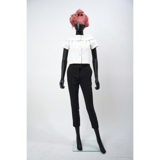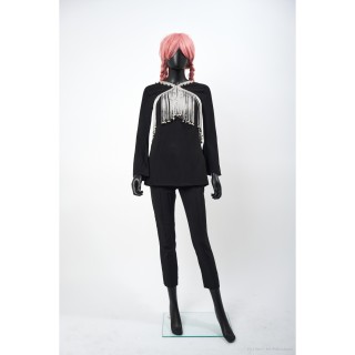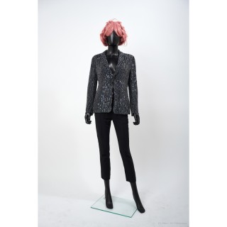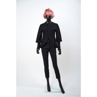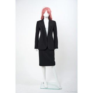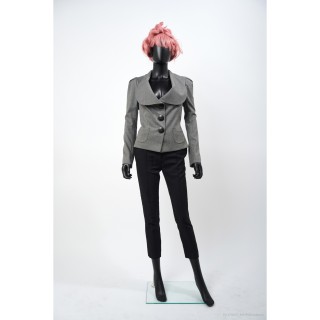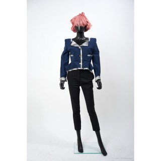 Thierry MUGLER TAILLEUR en crêpe polyester vert d'eau : veste galbante, boutons pressions sous petits motifs en métal argenté, jupe