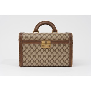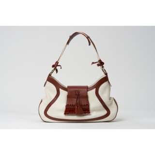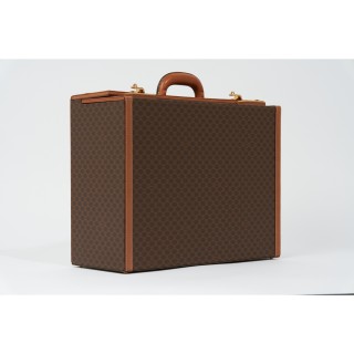 CELINE MALETTE en toile enduite siglée et cuir naturel, garnitures en laiton doré, fermoirs à code, doublure en toile