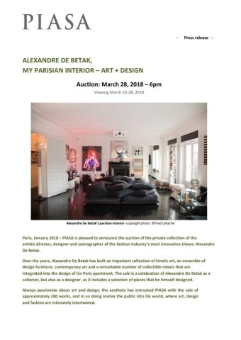 Paris, January 2018 – PIASA is pleased to announce the auction of the private collection of the artistic director, designer and scenographer of the fashion industry’s most innovative shows: Alexandre De Betak. Over the years, Alexandre De Betak has built an important collection of kinetic art, an ensemble of design furniture, contemporary art and a remarkable number of collectible robots that are integrated into the design of his Paris apartment. The sale is a celebration of Alexandre De Betak as a collector, but also as a designer, as it includes a selection of pieces that he himself designed.
