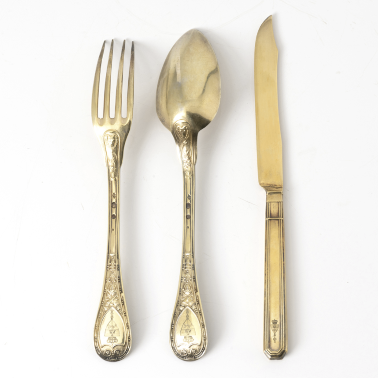 Plusieurs pièces aux armes du maréchal d'Empire Joachim Murat – figure héroïque de l’Empire - sont également présentées. Parmi elles, cette fourchette et cette grande cuillère en vermeil à décor de palmettes et de cornes d’abondances portent le poinçon de Pierre Benoit Lorillon. Cet orfèvre est reçu maître la même année que Biennais. A ces deux pièces, s’ajoute un couteau à fruits, lui aussi en vermeil. L’estimation basse de cet ensemble de trois pièces a été établie à 3 000 euros.