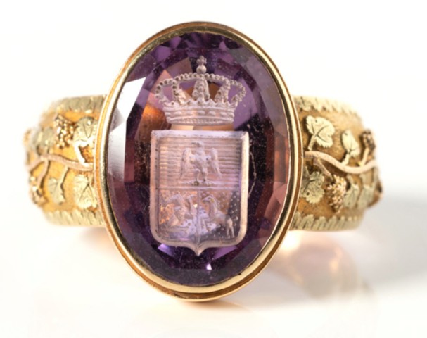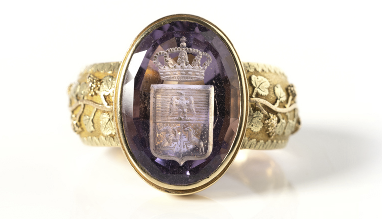 Les armes de la famille Murat se retrouve également sur cette chevalière en or ornée d’une améthyste ovale. Sur l’anneau de cette bague estimée entre 4 000 et 6 000 euros, se déploie un décor végétal de feuilles de vigne et raisins.